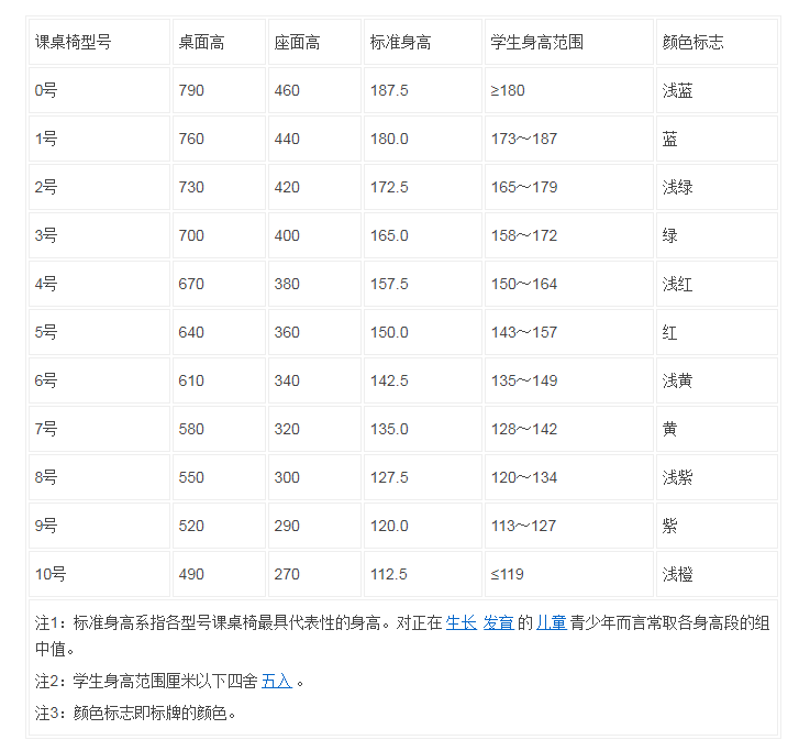 國家《學(xué)校課桌椅功能尺寸》標(biāo)準(zhǔn)(GB/T 3976-2014)中規(guī)定,中小學(xué)課桌和課椅型號各分為10種大小型號。從0號~10號課桌椅,桌面高度和座面高度逐級遞減,每一型號課座椅均有其適應(yīng)的學(xué)生身高范圍。根據(jù)型號表,學(xué)生可領(lǐng)到與自己身高相應(yīng)的課桌椅,有利于學(xué)生的形體發(fā)育和保護(hù)視力。