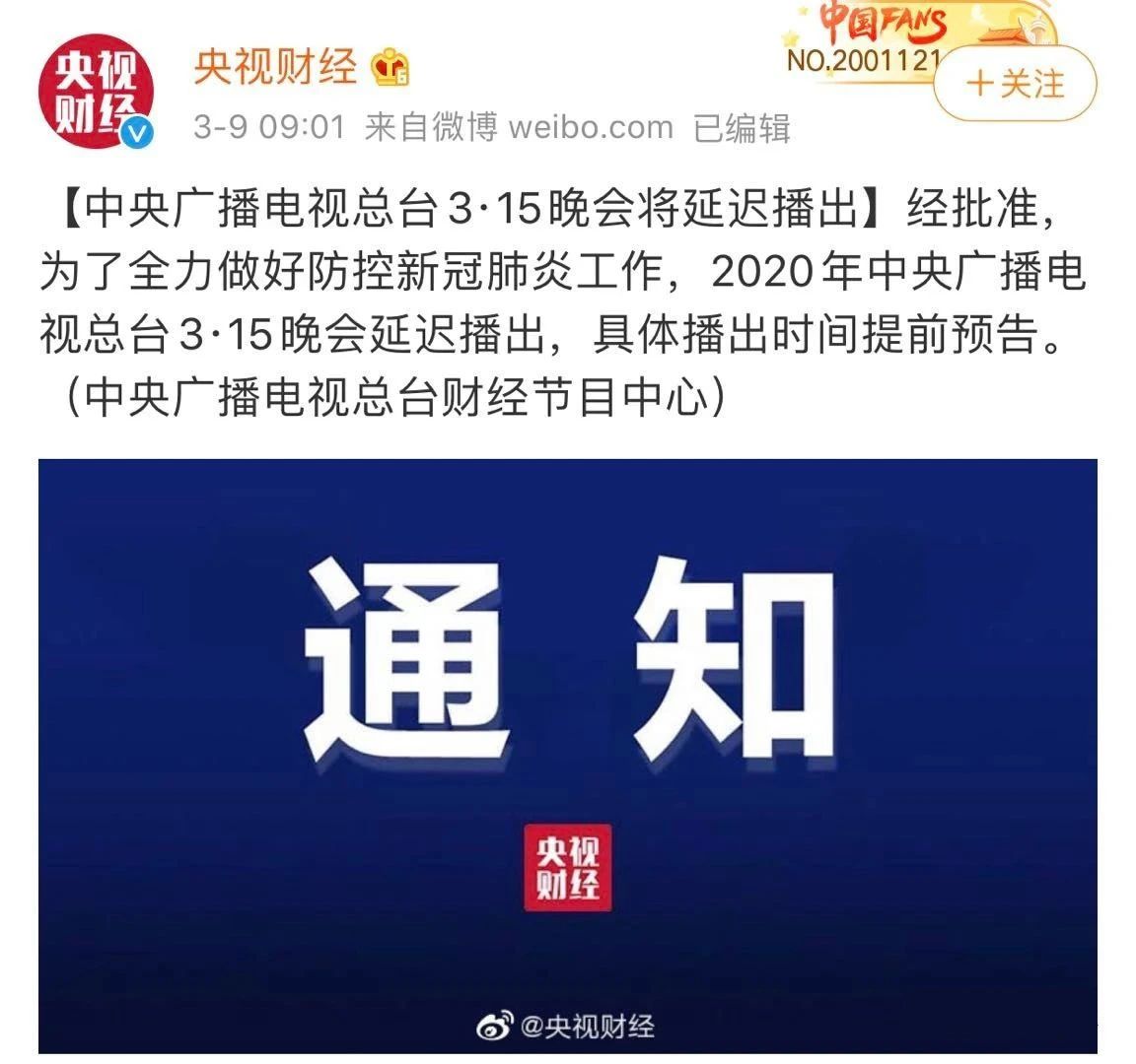 據(jù)@央視財(cái)經(jīng) 今天早上9點(diǎn)消息:經(jīng)批準(zhǔn),為了全力做好防控新冠肺炎工作,2020年中央廣播電視總臺(tái)3·15晚會(huì)延遲播出,具體播出時(shí)間提前預(yù)告。
