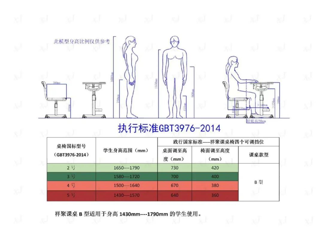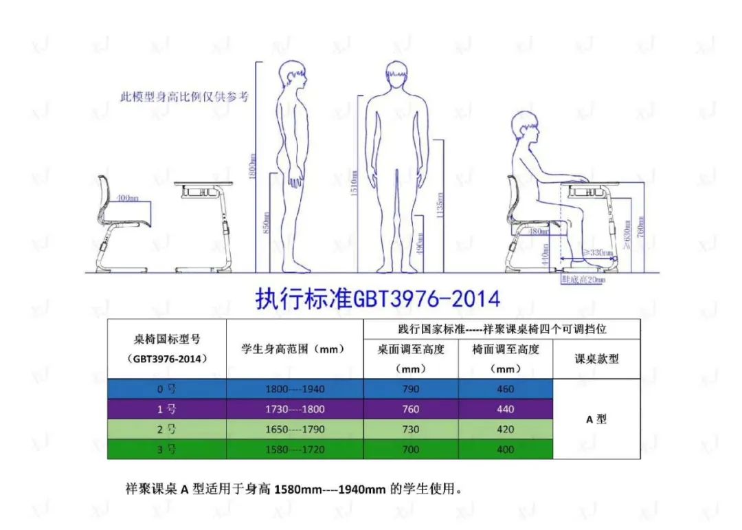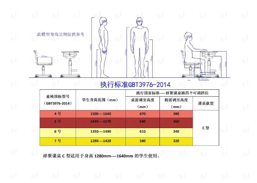 祥聚座椅根據(jù)國(guó)家標(biāo)準(zhǔn)設(shè)計(jì)了四大類(lèi)型符合不同身高層學(xué)生需求的課桌椅,更方便學(xué)校為學(xué)生提供合適的課桌椅。