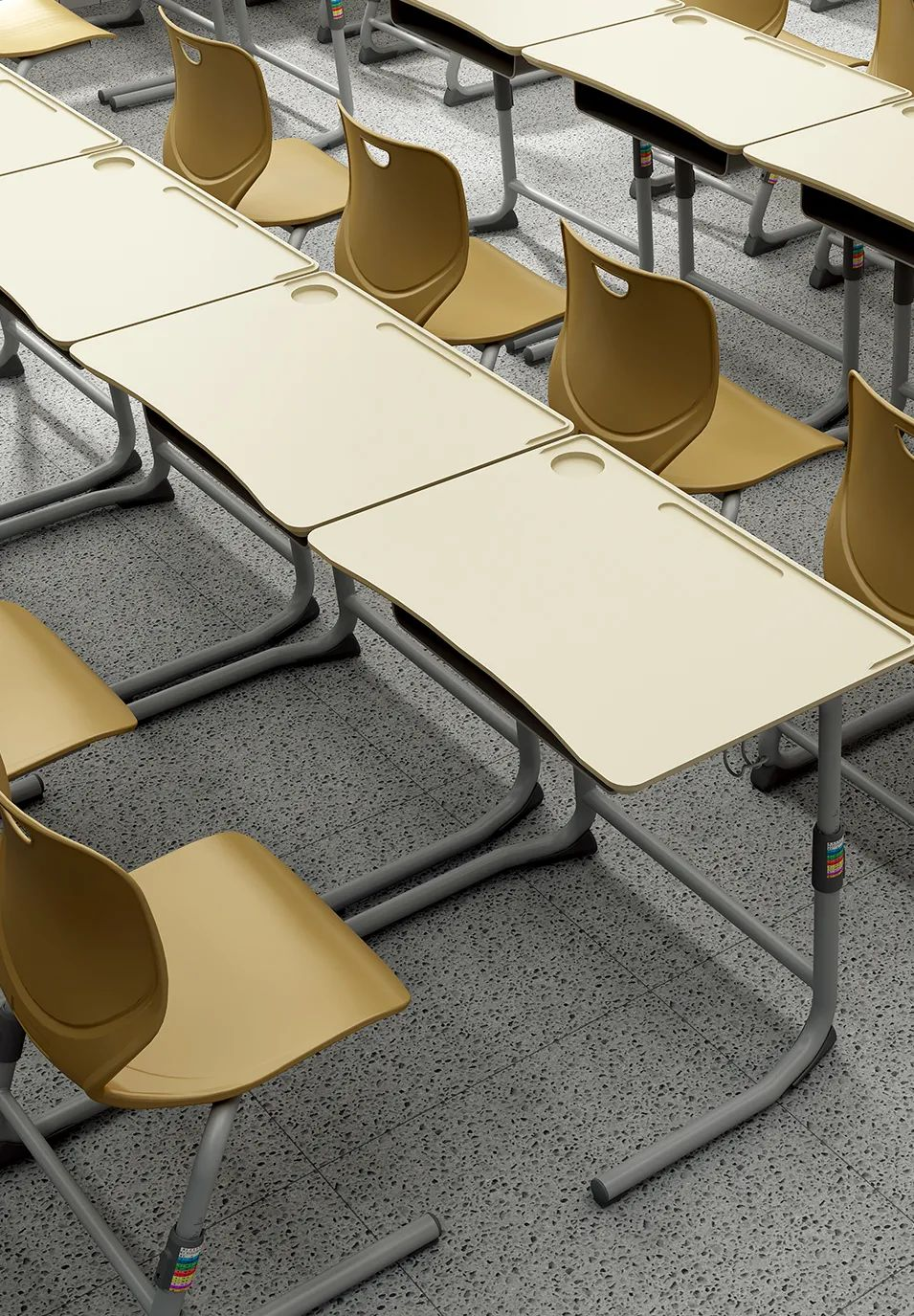 #靈活性高的的桌椅,能夠滿足多種教學(xué)場(chǎng)景的需求。目前提升靈活性比較成熟的做法是通過(guò)可自由轉(zhuǎn)動(dòng)的輪子、自由升降的桌椅、自由調(diào)節(jié)角度的桌面來(lái)實(shí)現(xiàn)。