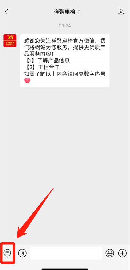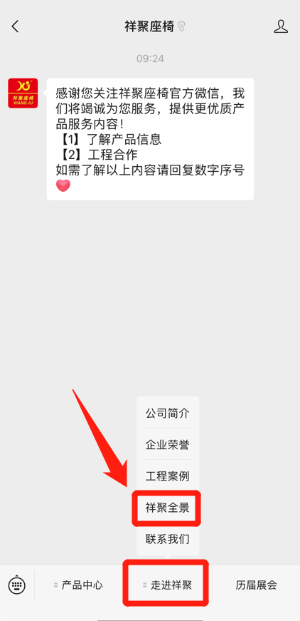 2、進(jìn)入祥聚座椅微信公眾號聊天界面,點(diǎn)擊左下角菜單欄,點(diǎn)擊“走進(jìn)祥聚”——“祥聚全景”