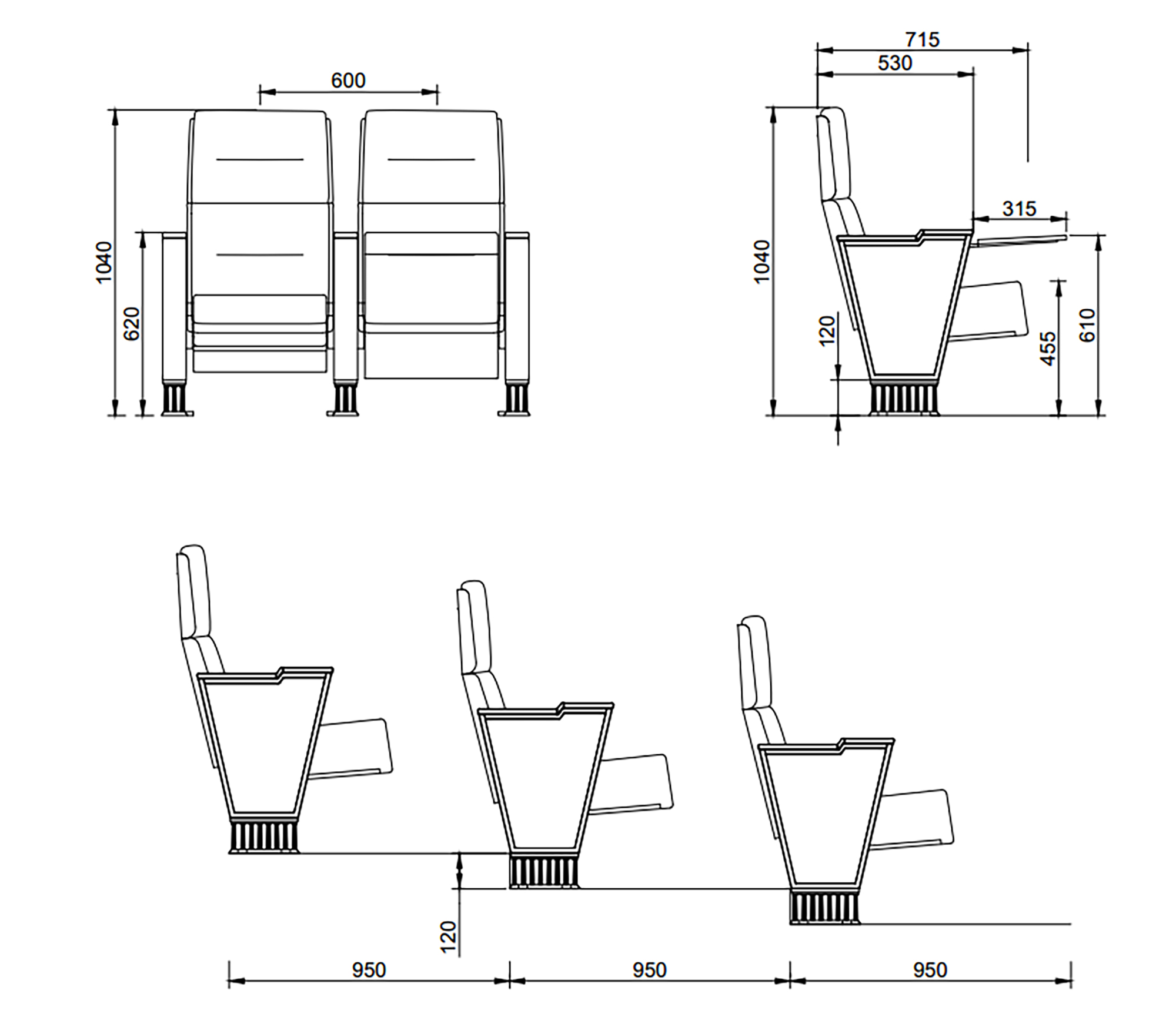 1.椅子總高度1050mm,連排座椅中心距離580mm,座面高度440mm;