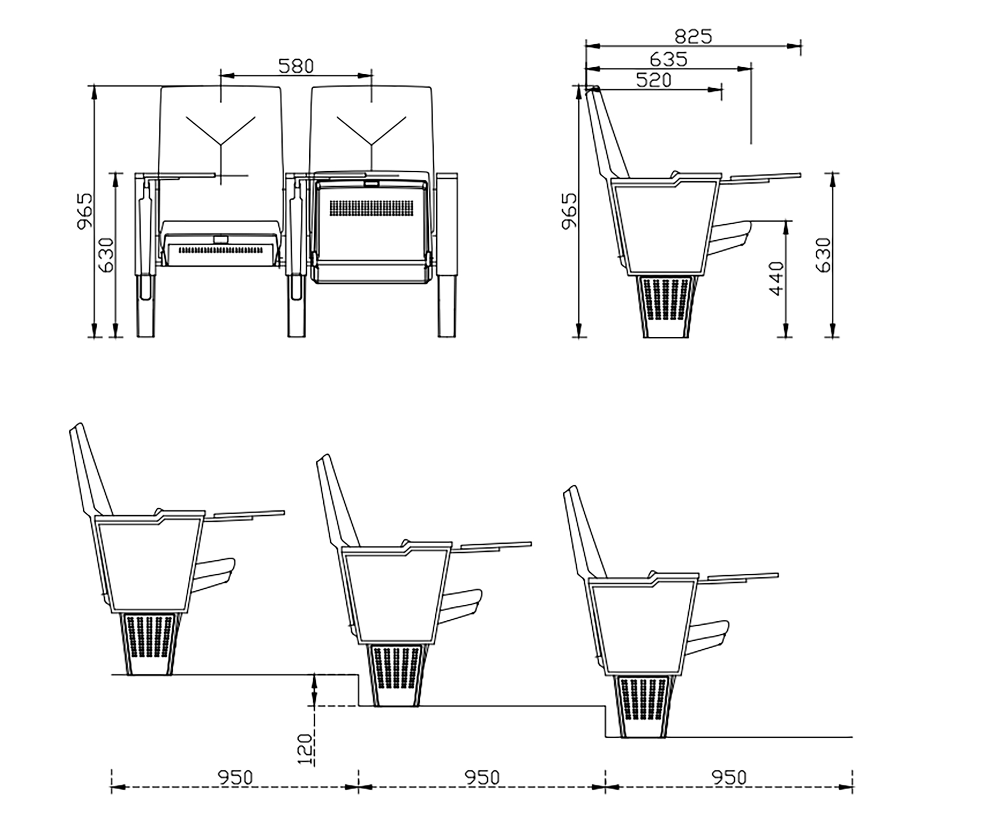 1.椅子總高度960mm,連排座椅中心距離560-580mm,座面高度440mm;